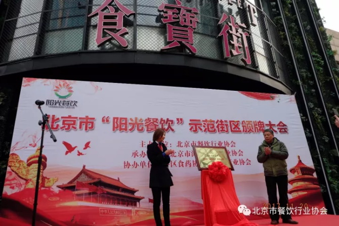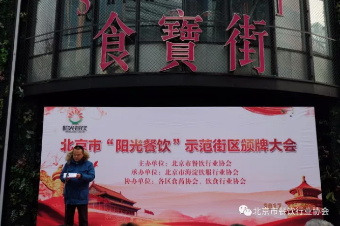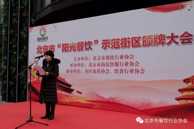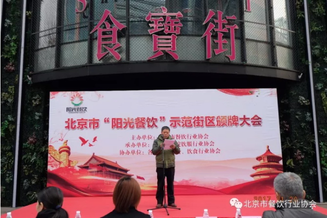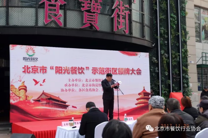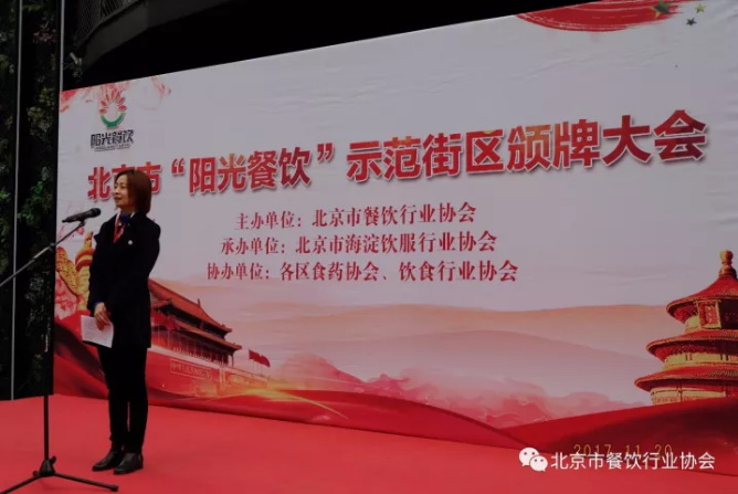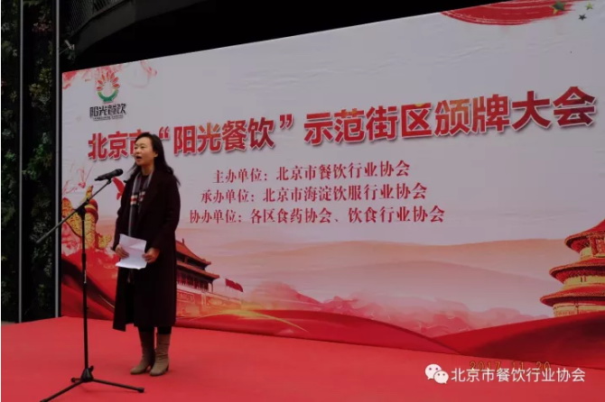 北京市餐饮行业协会秘书长贺保贵主持了11月21日“阳光餐饮”示范街区授牌仪式。