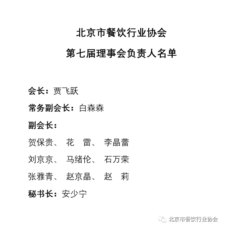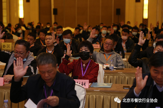 大会严格按照相关章程和规定程序,审议通过了六届理事会工作报告、六届财务报告、六届监事报告、章程修改、聘任秘书长、设立名誉职务人选等议案。在庄严的氛围中,与会会员现场通过无记名投票,选举产生了79名理事,5名监事,选举贾飞跃同志为北京市餐饮行业协会第七届理事会会长,白森森、贺保贵等10名同志为副会长,聘任安少宁同志为秘书长。