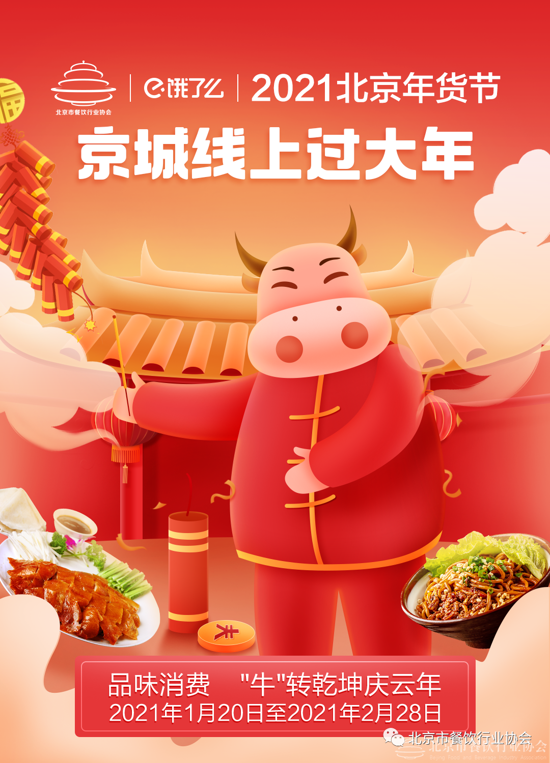 2020年新冠肺炎疫情对消费市场造成了较大冲击,为全力降低疫情影响,在政府部门的指导下,北京市餐饮行业协会拟组织举办“2021北京年货节·餐饮专场——京城线上过大年”活动。活动在确保疫情防控安全前提下,采取“政府搭台、企业唱戏、全民参与”的模式,利用多种方式,搭建首都餐饮行业联合促销和信息发布平台,带动2021年春节餐饮消费市场,服务京城百姓度过一个安乐祥和的春节。