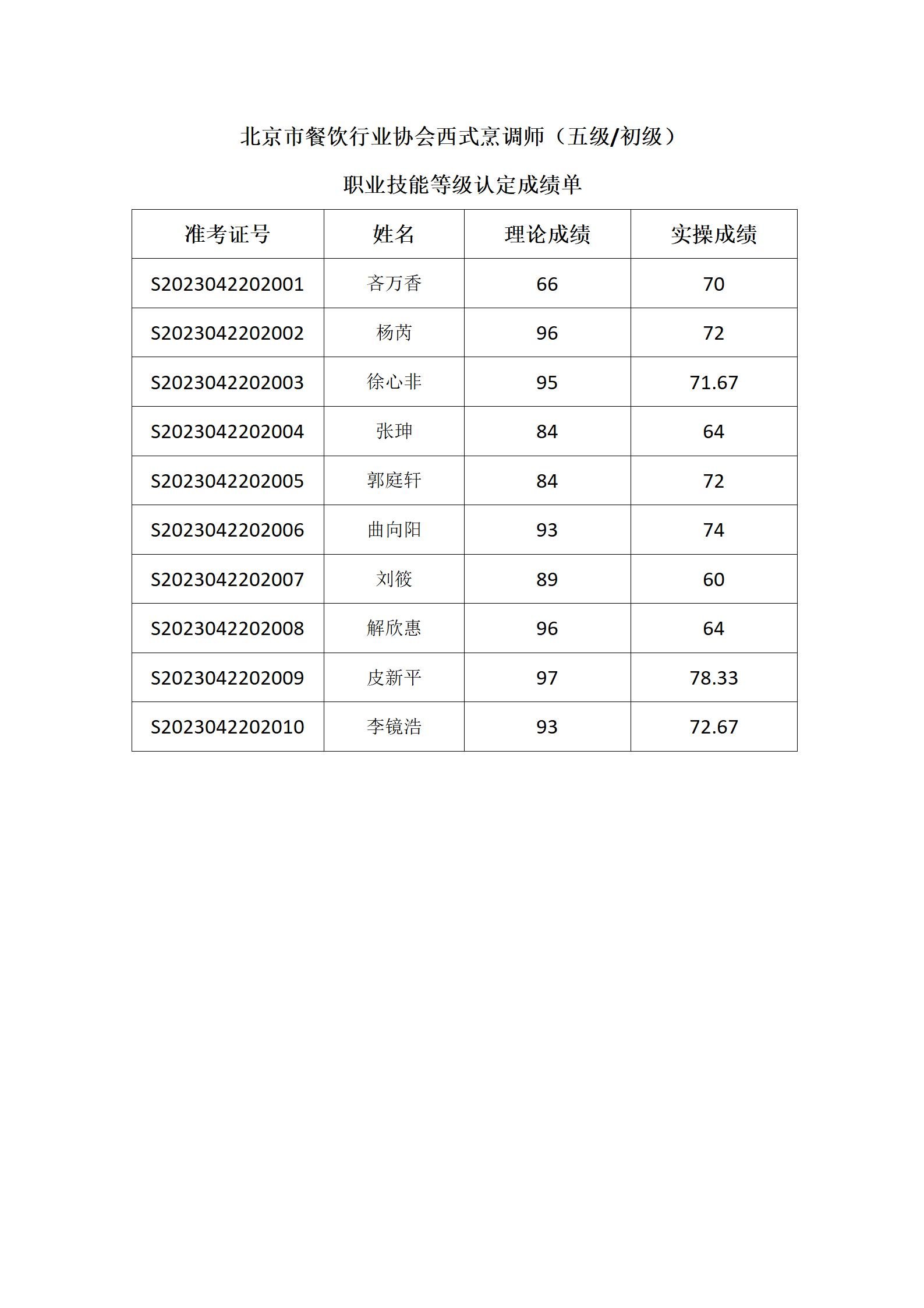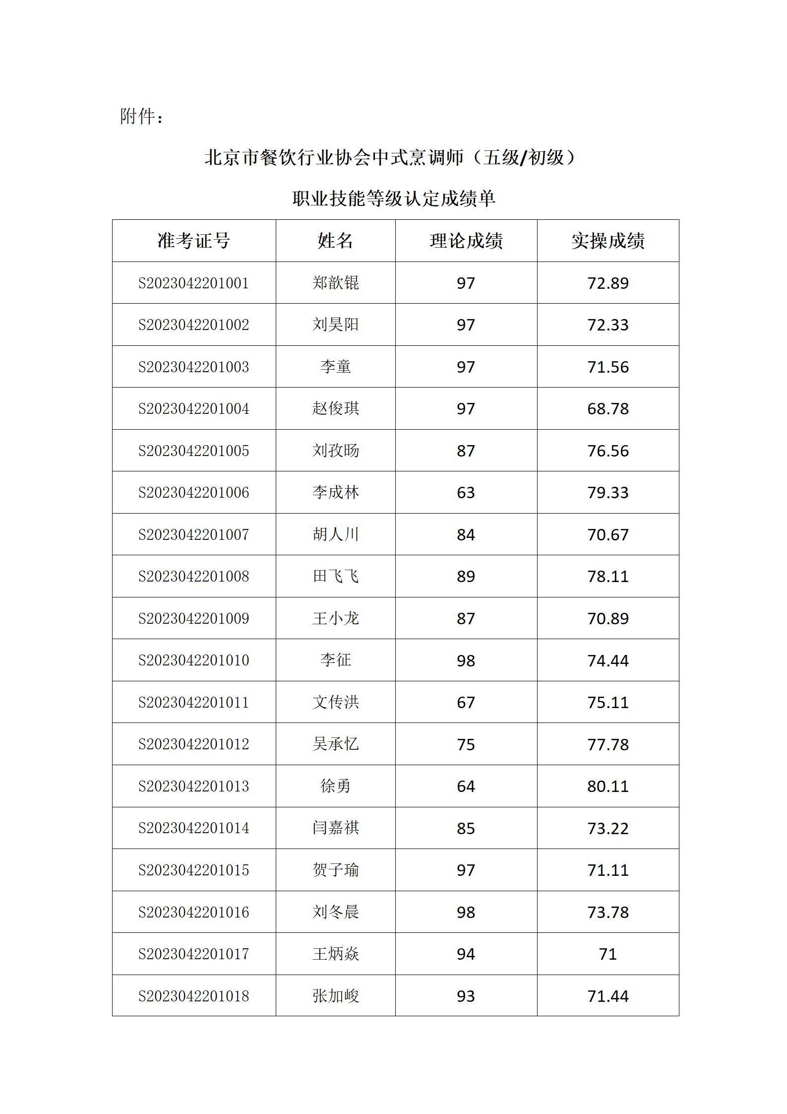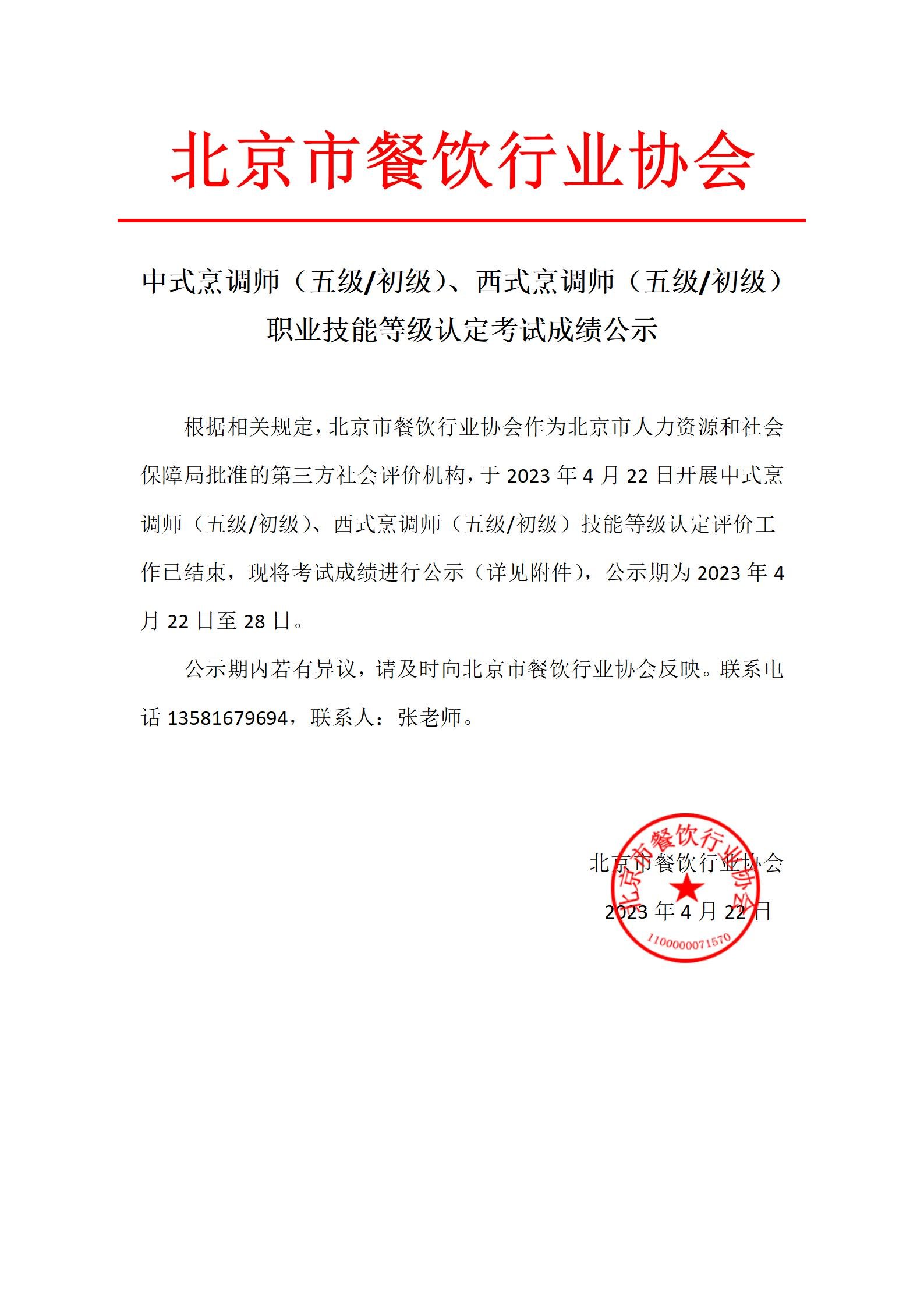 中式烹调师(五级/初级)、西式烹调师 (五级/初级)职业技能等级认定考试成绩公示