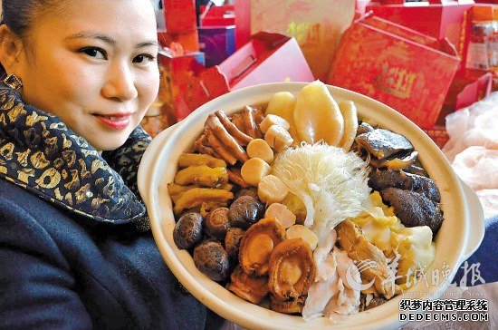 昨日,记者从广州酒家了解到,今年广州酒家集团继续推出两款经典盆菜———合家欢大盆菜(包括有海鲍片、蚝豉、柱脯、猪手、鹅掌、鱼球等20多种风味食材)及鲍参翅肚大盆菜(包括有鱼翅、鱼肚、鲍鱼、柱脯、海参等20多种名贵材料)。