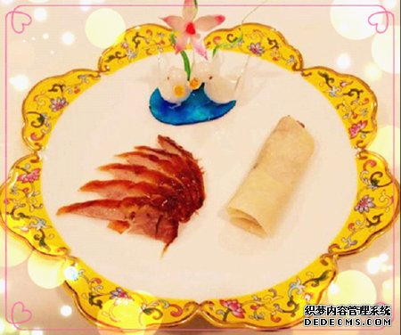 国宴现场,贵宾们欣赏全聚德烤鸭片制技艺的同时,一盘精致的“北京烤鸭”也送到了在场的近700位贵宾面前。“全聚德”为贵宾们提供的鸭肉和烤鸭卷,盛放在如意盘中,片鸭师将8片鸭肉摆成扇面,旁边码放一枚鸭卷,摆盘的点亮之笔在于鸭肉和鸭卷的上方摆的“乳鸭戏水”糖艺盘饰,两只洁白的小鸭子浮在蓝色的湖面上,甚是灵动与精致。糖艺作者是来自全聚德王府井店的北京烹饪大师张景宇,她也曾多次在全国比赛中获得大奖。