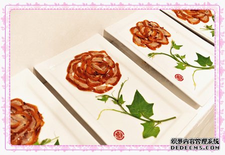 在片鸭技艺展示环节,全聚德集团精心选拔的八位片鸭师面带自信的微笑,整齐划一,步调一致地步入国宴现场,从烤鸭上场、片鸭、摆盘、展示整个过程在四分钟内全部圆满完成。为了让全聚德烤鸭兼具展示效果,在烤鸭摆盘的设计中,王府井店特别将造型设计成牡丹形状,片鸭师则需用16片鸭肉片组成国花牡丹,外圈7片,第二圈5片,第三圈3片,中心1片,配以丝瓜苗做成枝叶。片制摆盘后,厨师们还将餐盘端起以45度角,向在场的各国元首及嘉宾展示。此时,全聚德烤鸭传统片制技艺与绘画艺术跨界融合,由片片枣红色、香气宜人的“北京烤鸭”组合成的牡丹,雍容华贵,栩栩如生,“全聚德”通过美食文化向世界传递华夏饮食精华,展示烤鸭菜品即被定名为“盛世牡丹”。