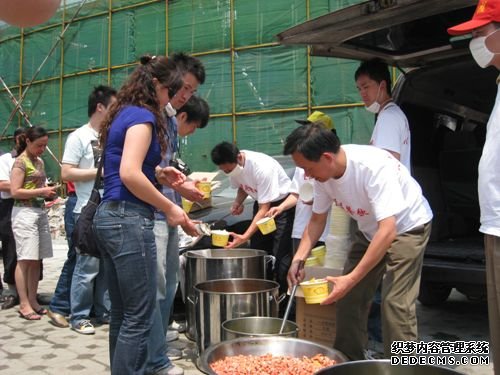 5月13日,德庄成都地区公司项中宁总经理,迅速组织了一支由50余人的“德庄抗震救灾自愿服务队”,然后分头行动,从原料采购,连夜制作,冒着灾区余震的危险,将3000余盒热腾腾的菜饭运送到都江堰地区。
